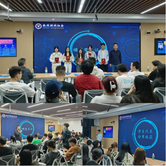 在师生互动环节,与会学生就测试理论、技术细节等踊跃提问。李萌老师结合实例深入解答,现场气氛热烈。随后的表彰环节,学院对项目中表现优异的实习学员进行了证书颁发,充分肯定其在实践中的专业表现。