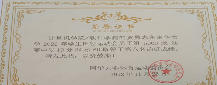 5000米不长不短的距离,需要的是全心全程的投入,漫漫长路,他一人独挡,运动场上,他是闪耀的流星。一声令下,比赛正式开始,贺勇志同学迈出矫健的步伐,坚定,执着,耐力和希望,在白色跑道的延伸中一点点凝聚!力量,信念和奋斗,在遥远的终点线上逐渐放光!比赛中途,他的汗珠直往下淌,那一头乌黑的头发早已被汗水打湿,他咬紧牙关,迈着早已精疲力尽的双腿向前奔着,纵有疾风起,人生不言弃。当他跨越终点的那一刻,他的身上有一抹用努力凝聚的金色光环在环绕,他不仅战胜了他人,也同样战胜了自己。最终,贺勇志同学在此次比赛中荣获第八名的好成绩,为我院再夺辉煌!