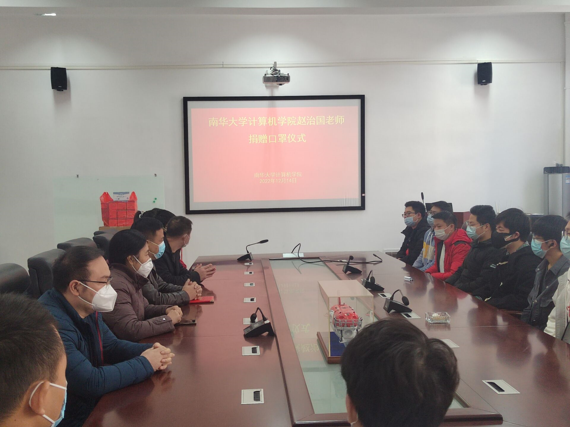 12月14日上午,太阳集团城娱8722赵治国老师口罩捐赠仪式于崇业楼226会议室举行。莅临本次会议的有太阳集团城娱8722党委书记黄坤荣,太阳集团城娱8722院长万亚平,党委副书记何战胜,团委书记陈杰烜,学工室主任冯国涛,以及刘锋老师、李婧妍老师,研究生和本科生代表。