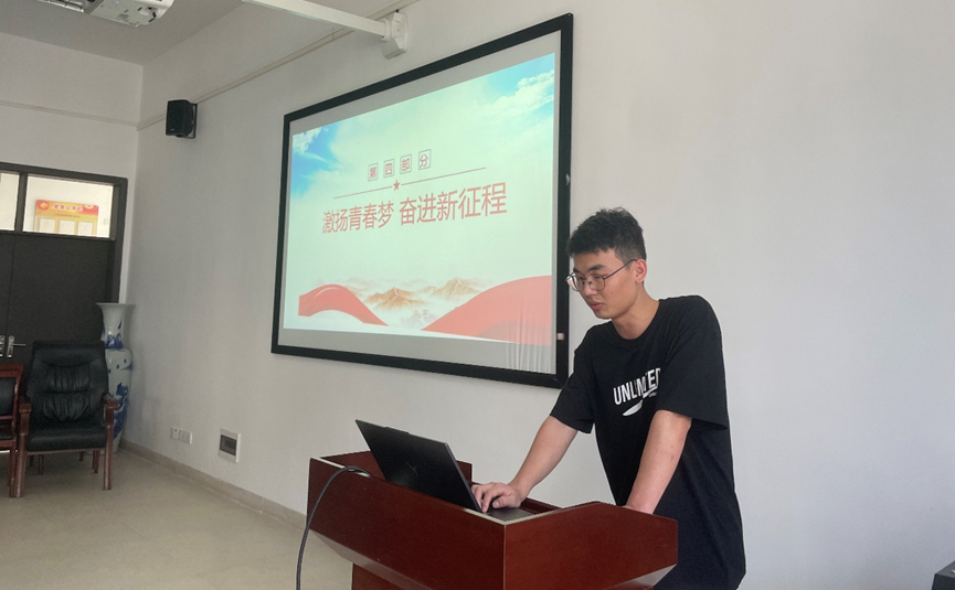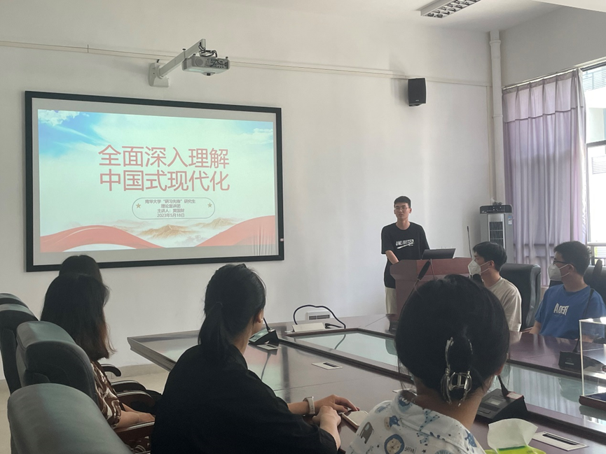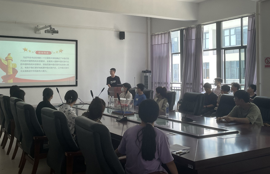 会议上,黄国财同学从认识中国式现代化的发展逻辑、理解中国式现代化的核心要义和把握中国式现代化的前进方向这三个维度带领大家深刻学习了中国式现代化,阐述了中国式现代化必须与党和人民的方向一致,还必须与中华民族伟大复兴的方向同行。
