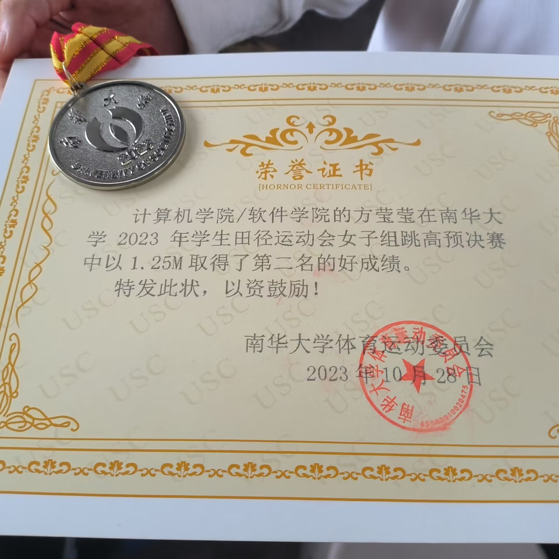 艰难方显勇毅,磨砺始得玉成,她的成绩也没有辜负她的努力,让我们恭喜方莹莹同学在本次田径运动会中取得了优异的成绩,我们也共同期待其他同学也能像方莹莹同学一样在未来的比赛中,再创佳绩,为我院争光!