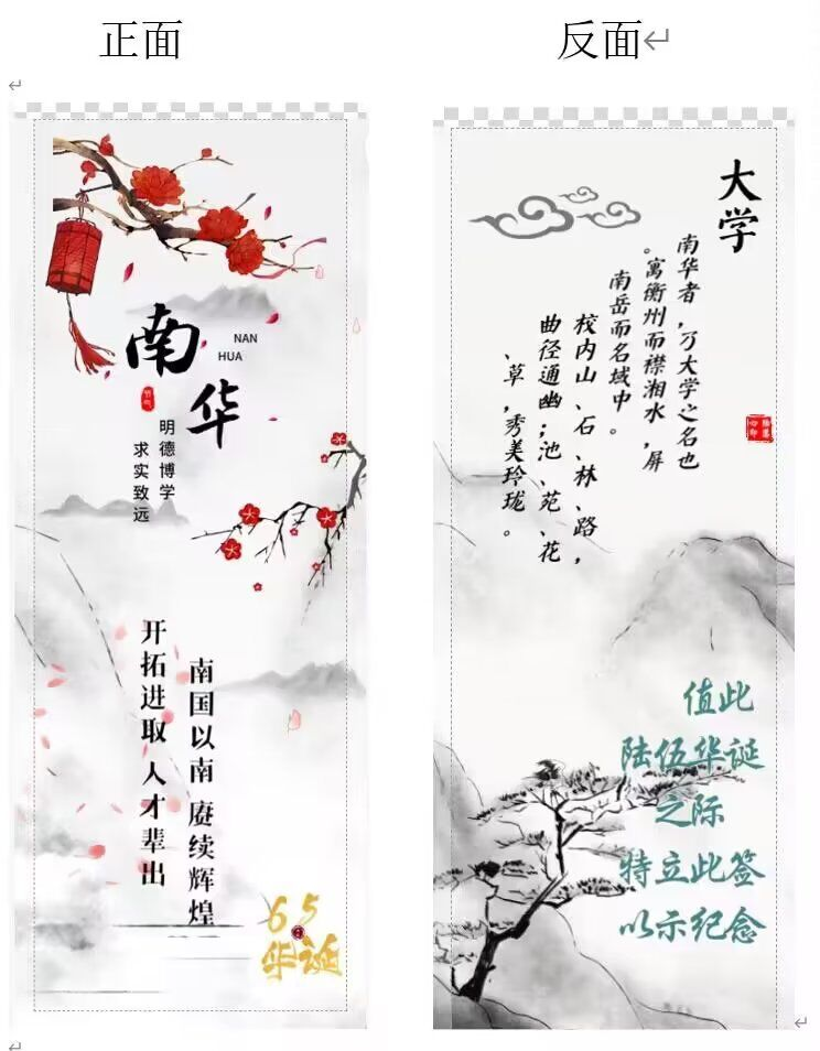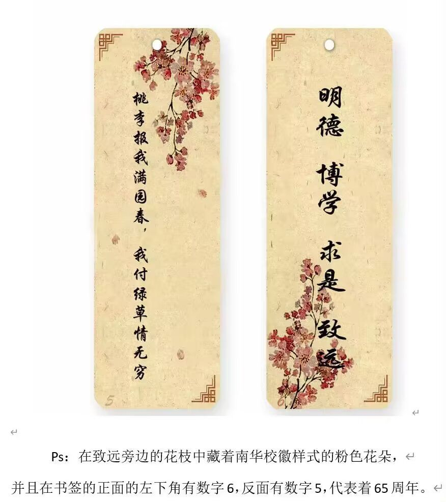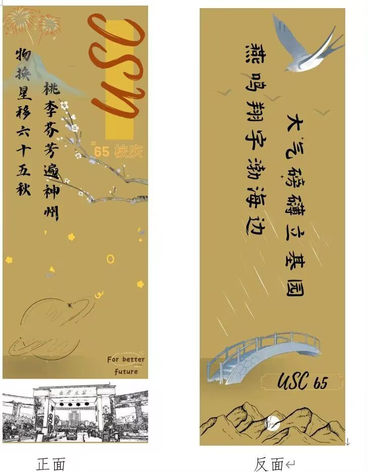 太阳集团城娱8722的小南瓜们通过将太阳集团tcy8722建校六十五周年的元素与诗词、名著等书籍中的话语誊抄于书签之中,并配以图画色彩等点缀,从而将对学校的祝愿与诗书底蕴凝聚于书签之中。一笔一画,尺寸间勾勒出染上温度的万语,书签设计将万语融进“签”言里,让我们感受着文字美与画面美的巧妙融合。