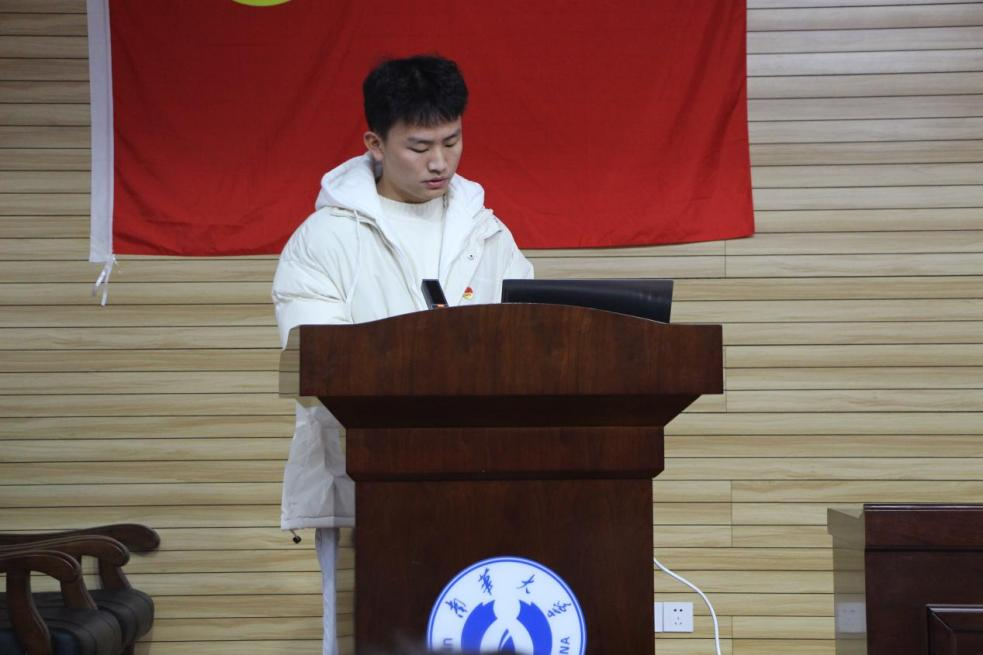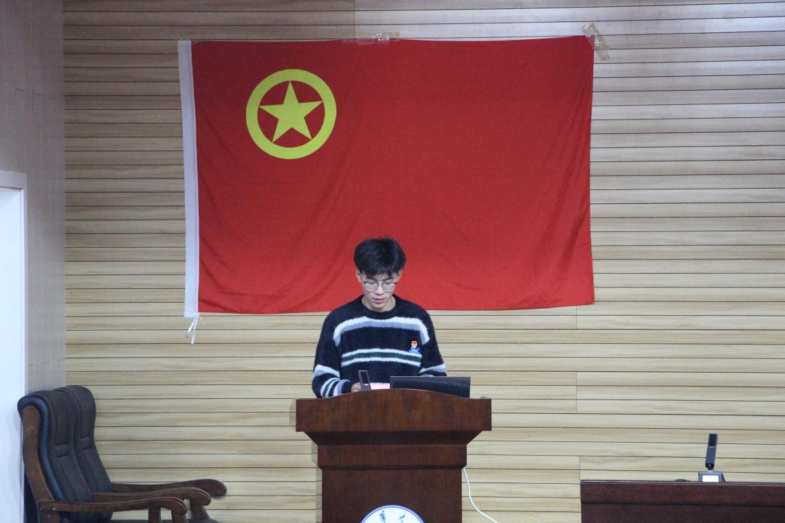 最后,院团委书记陈杰烜讲话,他讲述了当下入团流程的规范化。接着向我们介绍了共青团团旗的意义:红色象征中国革命的胜利;五角星、圆和黄色象征着青年一代要跟随共产党一起建设新中国。陈杰烜对同学们提出三点希望:要牢记自己是一名光荣的共青团员,勇于创新,养成良好的习惯;要自觉学习党的先进理论,并与自身的专业知识相结合,用自己的实际行动去影响身边的同学,一起进步;作为共青团的一员,要积极参与班级、团组织的活动,积极配合工作,按照团员的标准严格要求自己,起到先锋模范作用。最后,全体与会人员齐唱《光荣啊,共青团》,赤诚的歌声,诠释了团员们蓬勃的朝气。