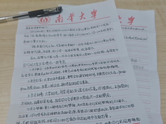 在金秋送爽、硕果累累的时节里南华迎来了迎新季,新生们远赴南华求学,对大学生活充满了期待。此时此刻,太阳集团城娱8722的“老客们”积极参与“写给新生的一封信”活动,亲笔写下满含期待与祝福的信。他们有不同的字迹,不一样的话语,却都蕴含着炙热的欢迎,无不在表达着我院学长学姐对新生的殷殷期盼。虽素未谋面,却见字如面,提笔写下的句句话语,能透过纸面,跨过空间,传递“前辈们”的关爱与祝愿。