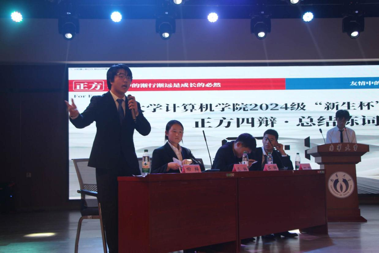 首场辩论赛以“季殿之争”展开。正方“For Four队”与反方“4399队”聚焦于辩题“友情中的渐行渐远是成长的必然还是遗憾的失去”发起辩论。双方辩手针锋相对,以犀利的言辞和巧妙的逻辑拆解论述,赢得阵阵掌声。总结陈词阶段,正方四辩再次强调成长的必然,紧扣论点,条理清晰。反方四辩总结观点,罗列论据,语速飞快却又字字清晰。双方的精彩辩论为观众和评委带来一场思维对撞的盛宴。