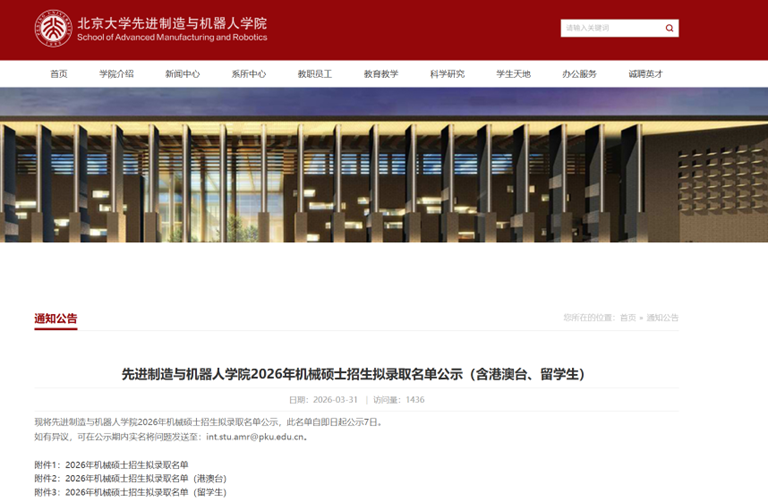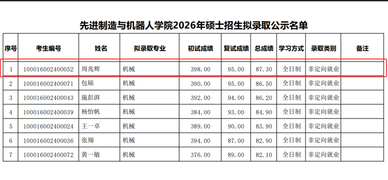 正值2026年硕士研究生招生拟录取结果陆续揭晓之时,传来喜讯,我校太阳集团城娱8722本2022软卓1班周兆辉同学凭借优异表现,以初试、复试双第一的成绩,成功被北京大学工学院先进制造与机器人专业拟录取。这是学院提升人才培养质量,促进高质量就业的一重要突破。
