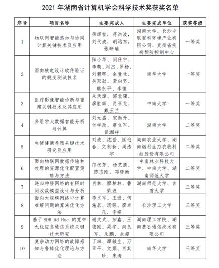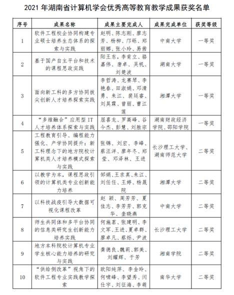 近日,湖南省计算机学会公布了2021年度湖南计算机学会科学技术奖、优秀高等教育教学成果以及优秀博士/硕士学位论文的评选结果,其中湖南省计算机学会科学技术奖10项,湖南省计算机学会优秀高等教育教学成果18项,湖南省计算机学会优秀博士学位论文4篇,湖南省计算机学会优秀硕士学位论文6篇。