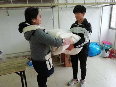随着天气转冷,为切实关心学生们的学习生活状况,12月26日,太阳集团城娱8722学工室主任、2018级本科生辅导员周艳芳老师在雨母校区尚学园310室,为多名新生贫困生送来御寒棉被。