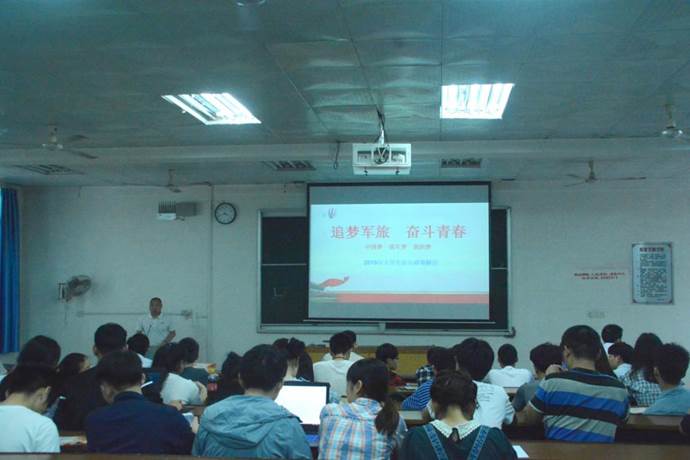 随后,汪先利老师为大家做了以“追梦军旅,奋斗青春”为主题的宣讲,他从大学生为什么入伍、国家对大学生应征入伍的相关政策解读和我校应征入伍的先进典型、应征入伍的流程等四个方面为大家进行了宣讲。汪老师从应征入伍是每个公民的责任和义务、光荣使命、祖国需要、自身能得到的磨砺和锻炼等方面号召同学们响应国家政策,积极参军入伍。汪老师重点介绍了今年国家对大学生应征入伍的政策,如经济政策、国家对退伍士兵的安置、入伍对大学生今后工作、学习、考研、工作等方面的鼓励政策,从应征入伍的“政治账、荣誉账、素质账、经济账、机遇账、风险账”等六本帐,对同学们进行了全面的思想动员。
