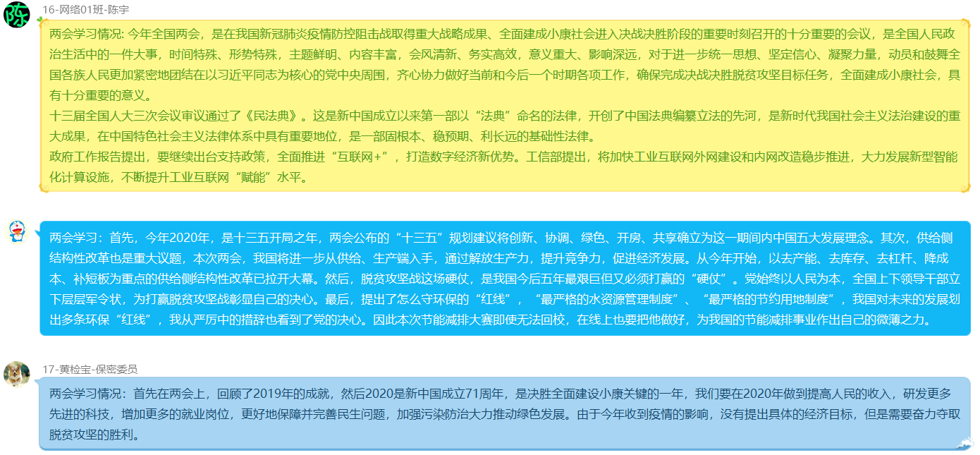 随后,支部全体同志认真学习“两会”精神,并就此发表了自己的看法,其中:16软卓01班的刘芳宇表示,疫情期间在北京实习,直接感受到了国家对基层民生的重视,国家下发两个亿的特别国债直达基层,兜底民生;16网络01班的陈宇表示:十三届全国人大三次会议审议通过的《民法典》是新中国成立以来第一部以“法典"命名的法律,开创了中国法典编纂立法的先河,是新时代我国社会主义法治建设的重大成果,在中国特色社会主义法律体系中具有重要地位,是一部固根本、稳预期、利长远的基础性法律;16软卓01班周文志表示:疫情期间,各地方政府发放大量消费券用于刺激经济的发展,全国人大委员提议建议国安局,对香港进行力法,解决香港近一年来的暴乱问题。