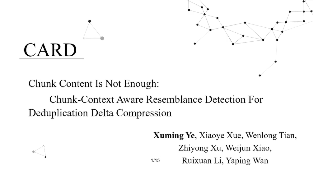 近日,我院2018级软件工程卓越班的叶旭明同学在太阳集团tcy8722田纹龙,万亚平,华中科技大学李瑞轩,美国Virginia Commonwealth University的Weijun Xiao, 美国Suffolk University的Zhiyong Xu等老师们的共同指导下,完成了论文《Chunk Content is not Enough:Chunk-Context Aware Resemblance Detection for Deduplication Delta Compression》,以第一作者身份向CCF-B类会议,数据压缩领域的顶级会议Data Compression Conference (DCC2022)投稿,并被录用为Short Paper,叶旭明同学在DCC2022会议上进行了论文宣读,这是叶旭明同学在国际会议上发表的第二篇科研论文。该同学曾于2021年以第一作者身份撰写论文投稿全球顶级学术会议之一的网络、体系结构和存储国际会议IEEE International Conference on Networking, Architecture and Storage(NAS 2021),录用后在大会上进行了宣讲。