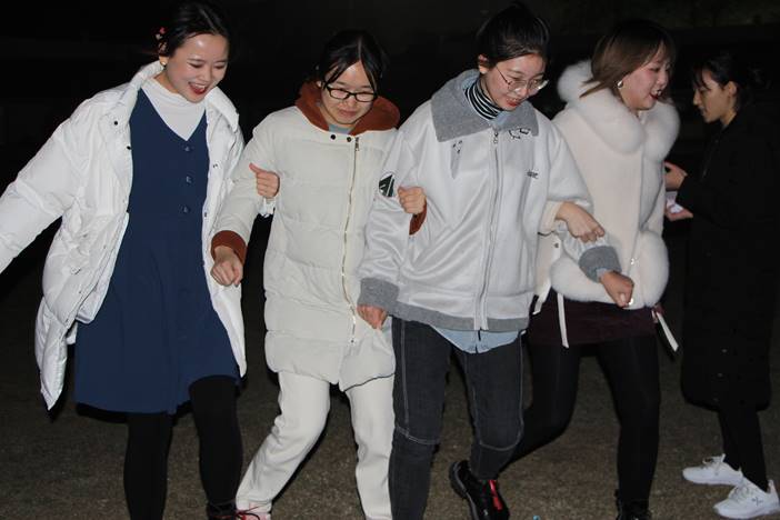 在面对坐地起身这个游戏时,不少队伍开始没有找到窍门,屡次失败,可是他们没有放弃,最终在彼此的相互支持下,同时发力,一起站了起来。而在你画我猜这个游戏里,考验的不仅仅是队员的配合,还有绘图者对词语的理解和猜图者对图画的理解,这是脑力与协力的碰撞。时间一点点过去,气温也越来越低,可是田径场上飘扬着的笑声正宣告着大家不惧寒冷,大家都在游戏中寻得了快乐与温暖,在团队合作中增进着彼此的感情,天气虽寒,可你我的心却格外温暖。