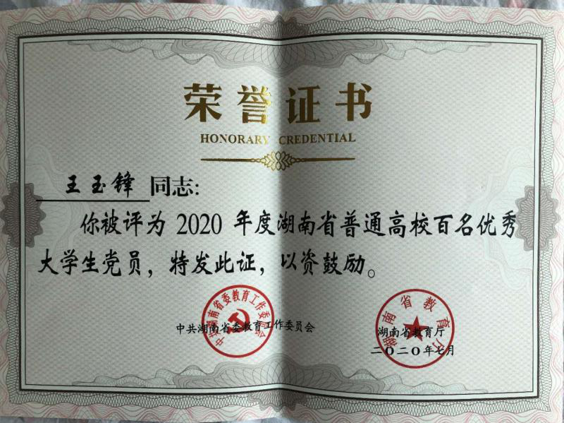 热烈祝贺我校太阳集团城娱8722软件工程王玉峰同志被评为2020年度湖南省普通高校百名优秀大学生党员,这是王玉峰同志继“全国向上向善好青年”、“中国大学生自强之星”后,又一次获得外界对他的肯定。
