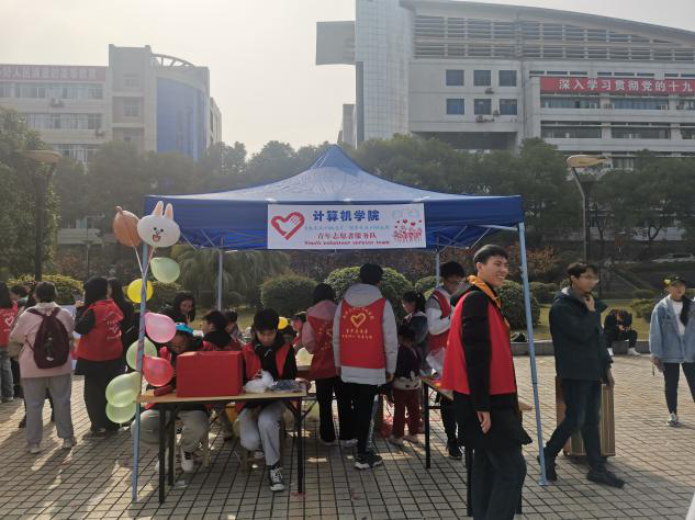 当天清晨,全体志愿者有序入场,待集合完毕,各院的青年志愿者们在校负责人的带领下在升旗台前进行庄严宣誓,声声誓言响彻南华广场。随后,在久违的阳光下,志愿者们在广场两侧支起并布置活动帐篷。我院志愿者们精心准备的趣味游戏吸引了众多同学们积极参与。“跳大绳,四人踩气球,搭纸牌,投球进箱,趣味问答”等小游戏,使同学们在紧张的学习生活中得到放松,享受到游戏带来的欢乐。欢声笑语充斥着整个广场。志愿者们耐心为同学们讲解游戏规则、发放奖品。同学们也在手机上为自己认可的学院助力投票。