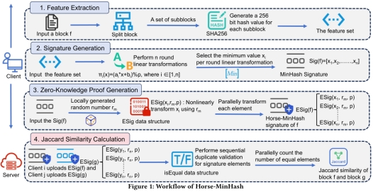 检测和处理相似数据在HTTP协议和内容分发网络中发挥着关键作用,尤其在多用户环境下,确保高效的数据传输和存储变得尤为重要。然而,传统的相似度检测方法面临着计算开销大和存储需求高的问题,限制了其在大规模数据集中的应用。在现有方法中,传统MinHash技术虽然通过生成固定大小的签名来降低计算开销,但其在处理大数据集时仍存在效率瓶颈,且在数据修改时的准确性和隐私保护方面也存在显著风险。为此,田纹龙老师的研究团队提出了创新性的Horse-MinHash解决方案。其核心创新在于融合了快速内容定义特征提取(CDFE)架构与非交互式零知识证明安全框架,构建出兼顾效率与隐私的相似度计算体系。该方案通过自主研发的成对等价性验证机制,成功实现了对加权MinHash等扩展算法的兼容支持。不仅降低了Jaccard相似度估计中的均方误差(MSE),而且在最小化计算开销的同时增强了隐私保护,在云存储优化、内容分发加速及隐私敏感数据处理等领域展现出显著应用潜力。