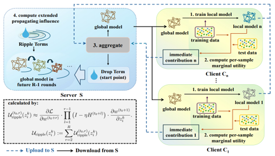 数据贡献度评估(Data Attribution)是联邦学习激励机制与可信协作的核心问题,其旨在量化各参与方或样本对全局模型性能的真实影响。现有基于Shapley值的理论方法通常面临高昂计算复杂度,同时忽略了数据影响的时序传播特性,而无法有效反应样本的真实影响。团队提出了一种在单次联邦训练过程中实现高精度、低开销数据价值归因的全新框架——Ripple Shapley,为联邦学习中长期影响建模提供了理论突破与实践路径。首次从时序传播视角出发,将样本影响分解为Drop项(刻画样本在初始轮训练中的即时效用)与Ripple项(建模样本影响如何经多轮全局更新逐步扩散)。这一建模揭示了联邦优化的递归依赖结构,实现了对跨轮次影响路径的显式追踪,从而将Shapley值从静态公平性理论拓展到动态影响归因机制。