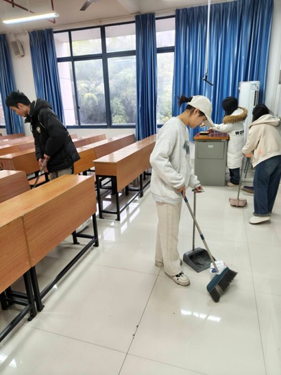 在实践环节,支部在雨母楼组织开展劳动教育活动。活动过程中,党员同志们团结协作,整理讲台、清理灰尘。党员同志们用实际行动展现了吃苦耐劳的优良品质,不仅为师生营造了整洁舒适的学习环境,更在劳动中锤炼了党性,进一步增强了支部的凝聚力和服务意识。