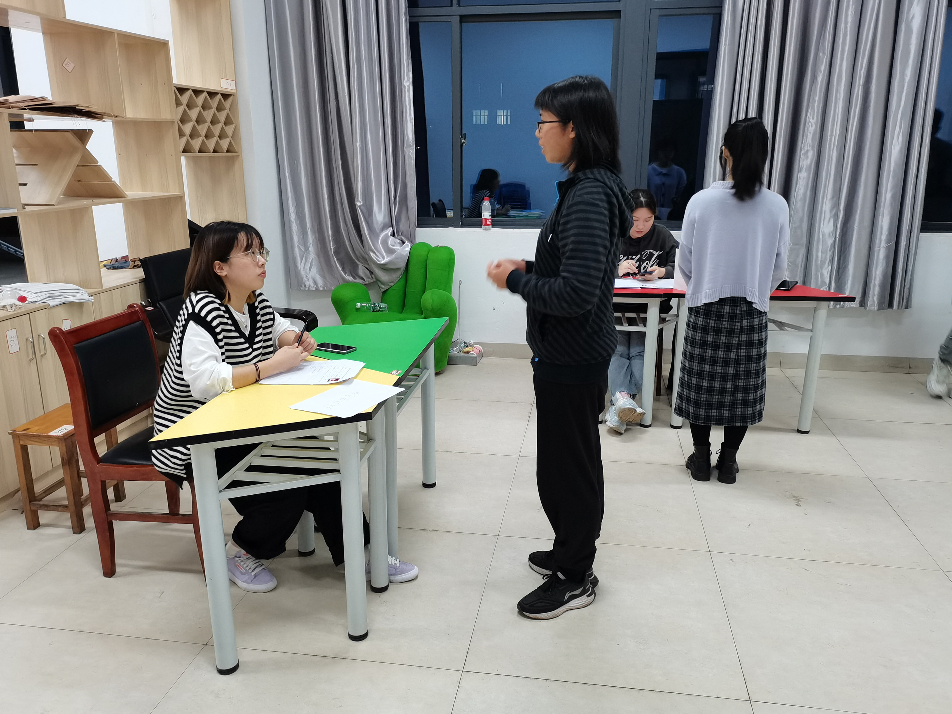 面试开始前,各部门的竞选者在303教室候场,随后依据安排好的部门顺序,竞选者们依次进入302教室进行面试。面试时,面试者首先做一个简略的演讲,进行自我介绍、阐述自己的经历、对竞聘部门工作的认识、工作设想与展望等。然后面试官对竞选者进行公开提问,提问内容涉及到如何处理自己部门与其他部门关系;对部门工作中出现的问题该如何处理;如何合理安排学习与部门工作;将如何开展招新工作后的新干事培训等关于部门管理方面的内容。对于这些问题,竞选者也始终以自信、热情的态度,阐述自己的观点,表达自己在部门管理上的独特见解。