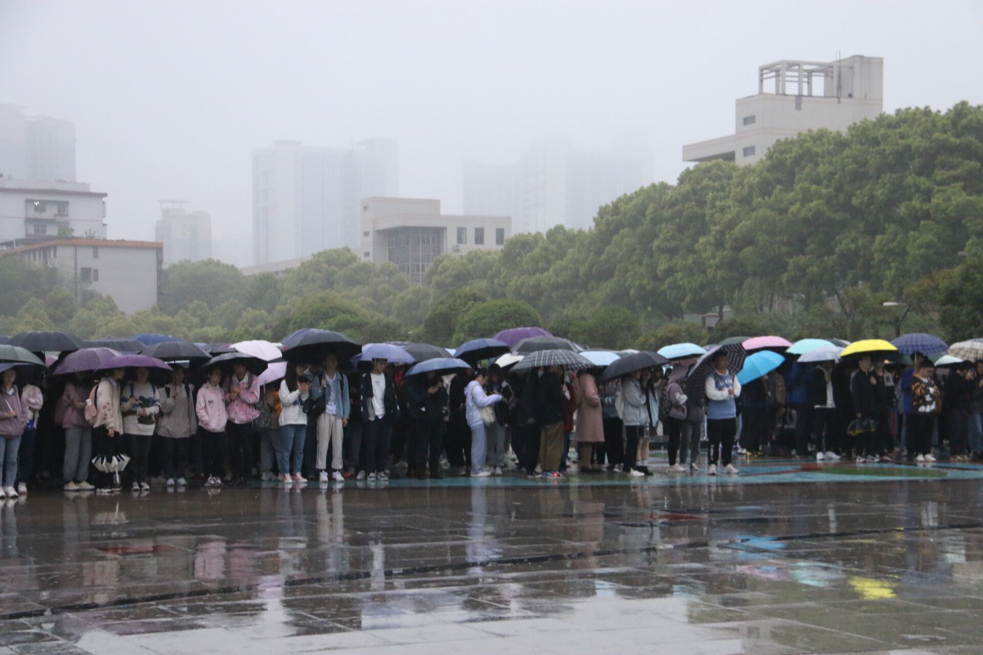 会议第一项升国旗。当雄壮有力的《义勇军进行曲》响起时,全体师生面向国旗行注目礼,鲜艳的五星红旗在风雨中冉冉升起,五星红旗随风飘扬,点燃了学生们强烈的爱国热情。虽然天公不作美,但是雨水还是阻挡不了同学们对祖国、对党的热爱以及祝福。